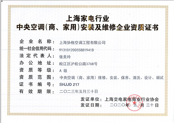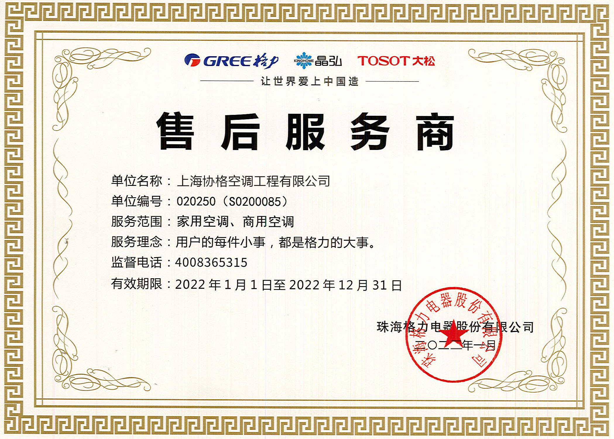 上海協(xié)格機(jī)電科技股份有限公司于2003年成立,是一家專(zhuān)業(yè)從事空調(diào)設(shè)計(jì)、銷(xiāo)售、安裝、維修、保養(yǎng)為一體的家用和商用空調(diào)專(zhuān)業(yè)公司。是格力空調(diào)上海地區(qū)的特約經(jīng)銷(xiāo)商和技術(shù)服務(wù)中心,是上海市家用電器安裝、維修以及資質(zhì)企業(yè)。公司擁有暖通技術(shù)、高級(jí)工程師、工程安裝等多方面專(zhuān)業(yè)人才。公司常年以來(lái)堅(jiān)持客戶(hù)利益至上的原則,設(shè)計(jì)、選材、安裝,力求精益求精,是上海地區(qū)格力授權(quán)服務(wù)商。