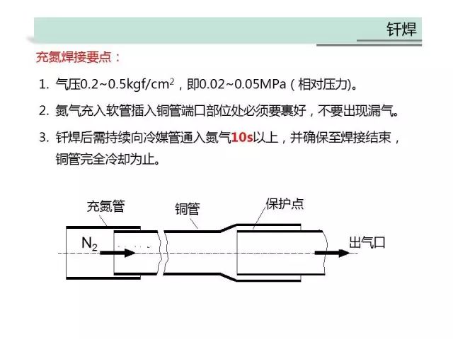 ②、為了避免這些問題,釬焊時結(jié)束必須持續(xù)向冷媒管通入氮氣10s以上,并確保氮氣流經(jīng)正在操作的焊點,直至焊接結(jié)束,銅管完全冷卻為止。