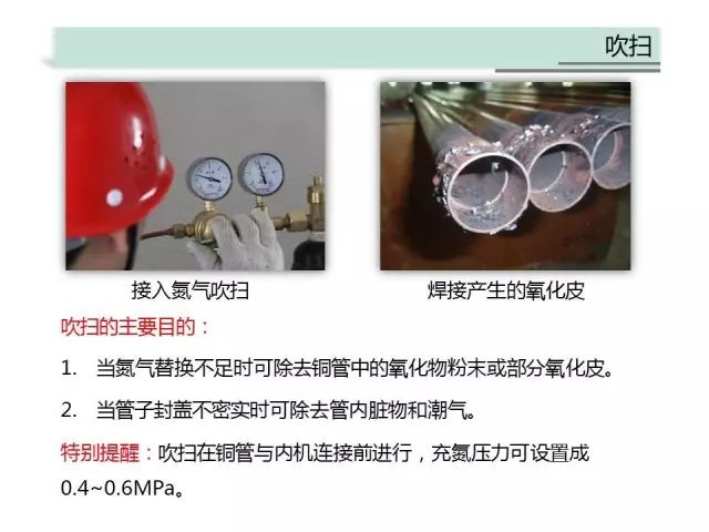 在實際施工中有些工人可能會出現(xiàn)充氮不充分,造成銅管內(nèi)部有氧化皮殘留,有沒有什么辦法補救呢?當(dāng)然有,那就是用高壓氮氣對管道進行吹掃,操作方法見下圖: