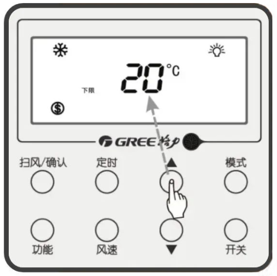 ③按“上三角符號”或下三角符號“鍵調(diào)整節(jié)能溫度限值,按"掃風(fēng)/確認(rèn)”鍵開啟節(jié)能模式。
