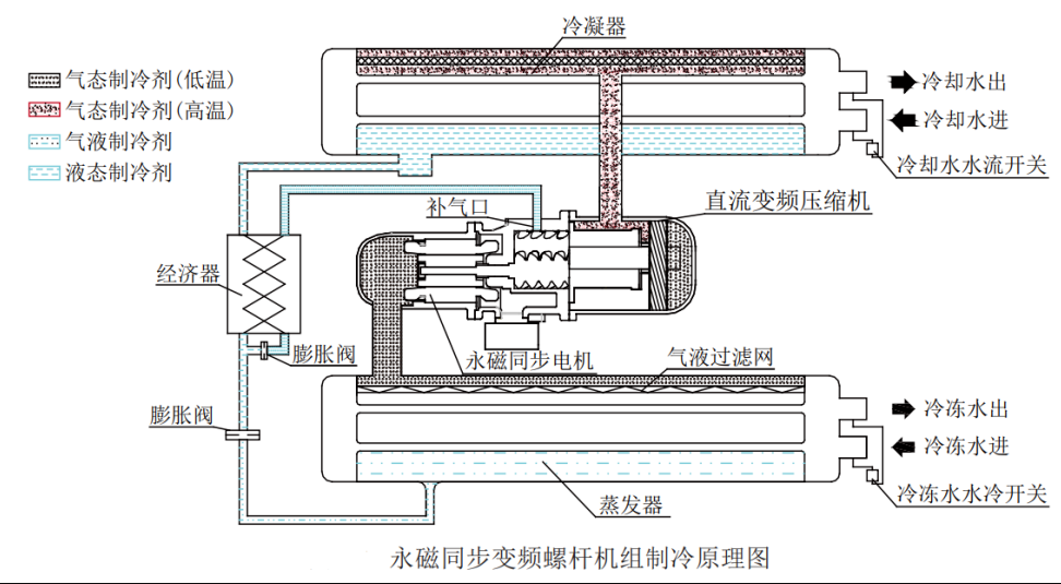 蒸發(fā)器中的制冷劑蒸汽被螺桿壓縮機吸入后,電機通過壓縮機轉(zhuǎn)子對其施加能量,使制冷劑蒸汽的壓力提高并進入冷凝器;與此同時冷劑蒸汽的溫度在壓縮終了時也相應(yīng)提高。