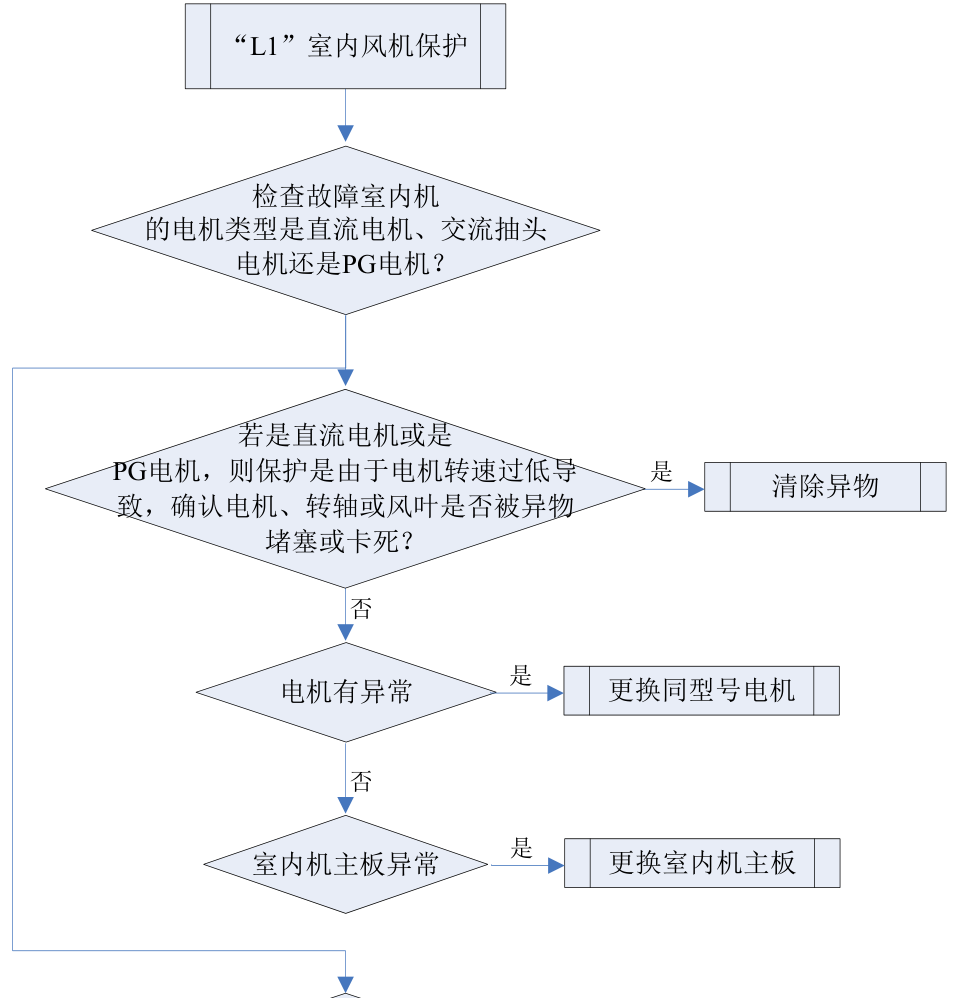 故障判斷條件和方法:檢測室內(nèi)機(jī)轉(zhuǎn)速是否過低或停轉(zhuǎn),或是否有外部風(fēng)機(jī)保護(hù)信號轉(zhuǎn)入,若是,則判斷為內(nèi)風(fēng)機(jī)保護(hù)。