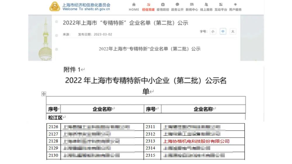 2023年3月2日上海市經(jīng)信委公示了2022年上海市專精特新中小企業(yè)名單。上海協(xié)格機(jī)電科技股份有限公司被認(rèn)定為“專精特新”中小企業(yè)稱號!