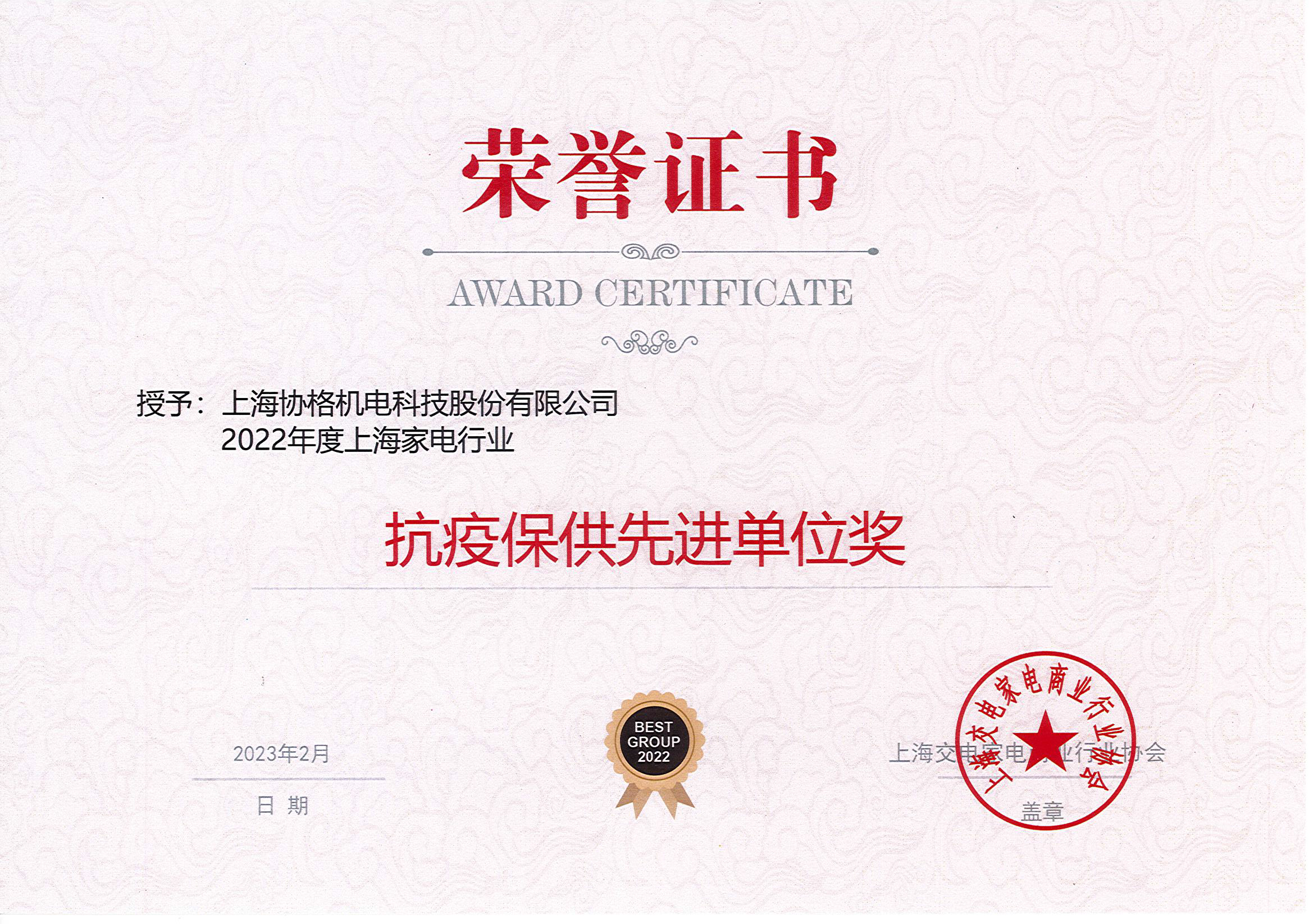上海協(xié)格機(jī)電科技股份有限公司榮獲“2022年度上海家電行業(yè)抗疫保供先進(jìn)單位”稱號。