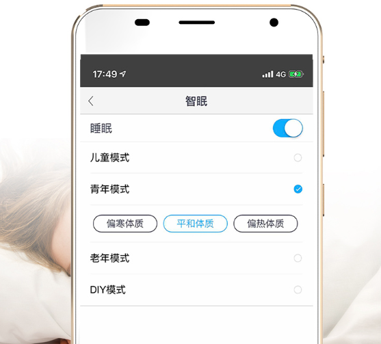 針對不同人群的不同體質(zhì),和夜間睡覺習(xí)慣,特設(shè)智眠模式。為不同體質(zhì)人群,定制睡眠曲線。比如選擇青年模式下的平和體質(zhì),開始個性化定制睡眠模式,自動精細(xì)調(diào)節(jié)溫度、送風(fēng)角度和風(fēng)速,打造個人專屬的舒適睡眠環(huán)境。