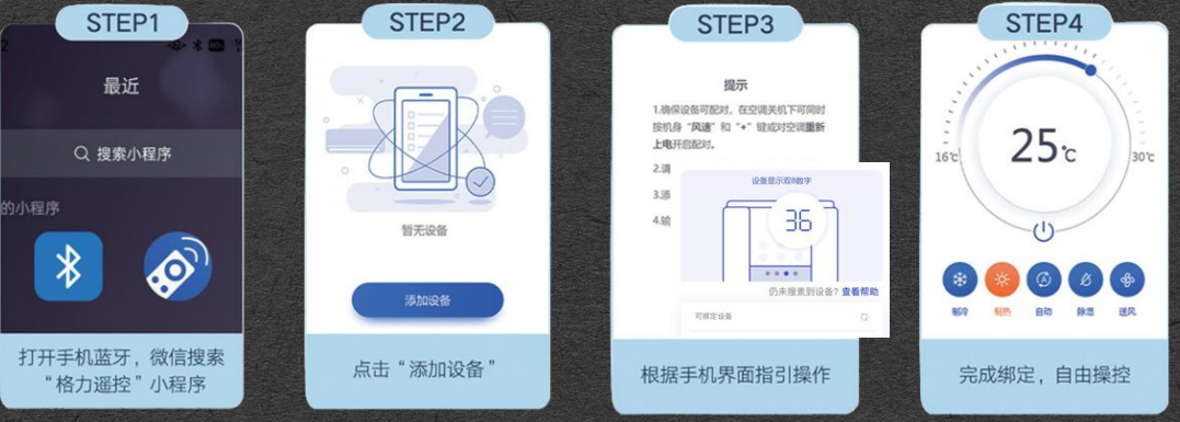 除此之外,為提高顧客使用體驗(yàn),簡化使用方法,2024冷年格力推出藍(lán)牙閃控功能。此功能無需下載APP,在離線情況下也能簡單易cao作。cao作方法:打開微信小程序,搜索“格力遙控”,四步即可輕松連接空調(diào)。