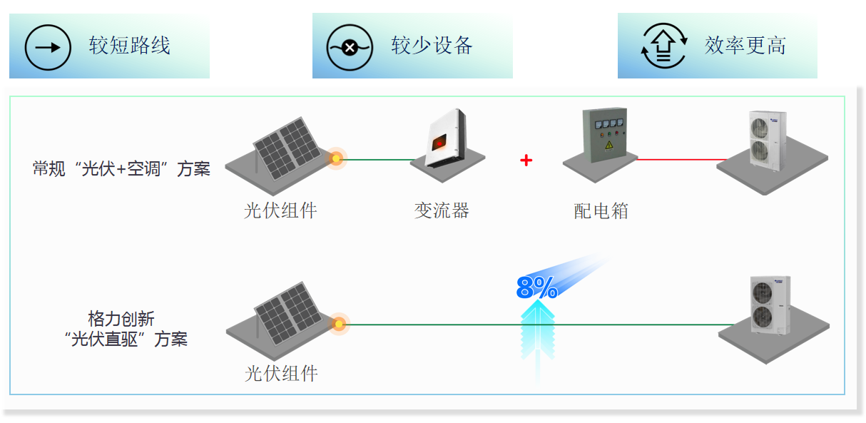 格力創(chuàng)新“光伏直驅(qū)”方案路徑短,系統(tǒng)效率高,清潔能源以Z短路徑驅(qū)動空調(diào)運行,光伏直驅(qū)利用率達(dá)99%,相比傳統(tǒng)方案,減少多次轉(zhuǎn)換,提高系統(tǒng)效率可達(dá)到8%的效率提sheng。