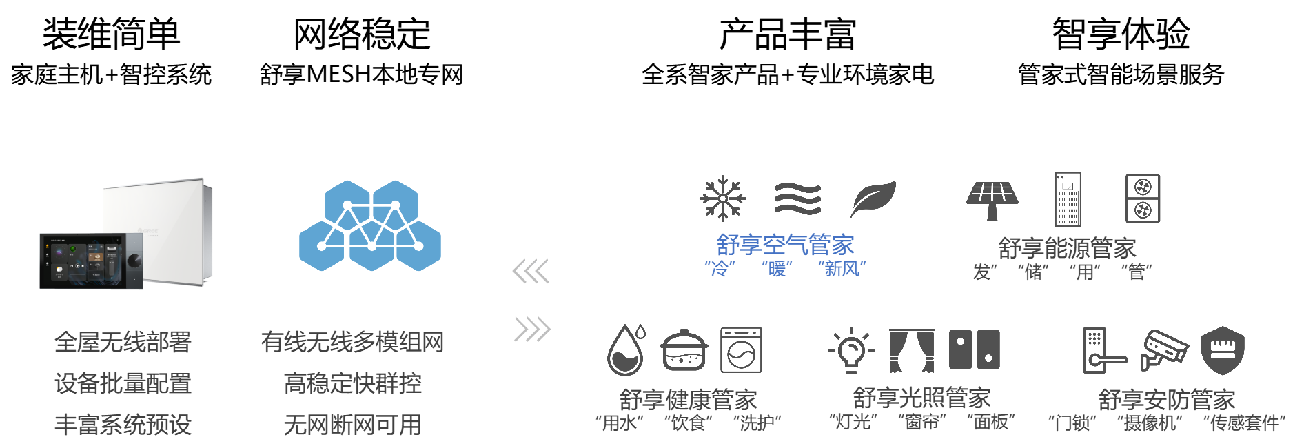 以豐富zhuan業(yè)的全屋空氣、健康、能源、光照、安防系統(tǒng)及產(chǎn)品解決方案為基礎(chǔ),以隨時隨地、全場景穩(wěn)定可靠的智能控制系統(tǒng)為技術(shù)底座,為用戶打造“系統(tǒng)+網(wǎng)絡(luò)+產(chǎn)品+服務(wù)”的格力全屋智能價值閉環(huán)。