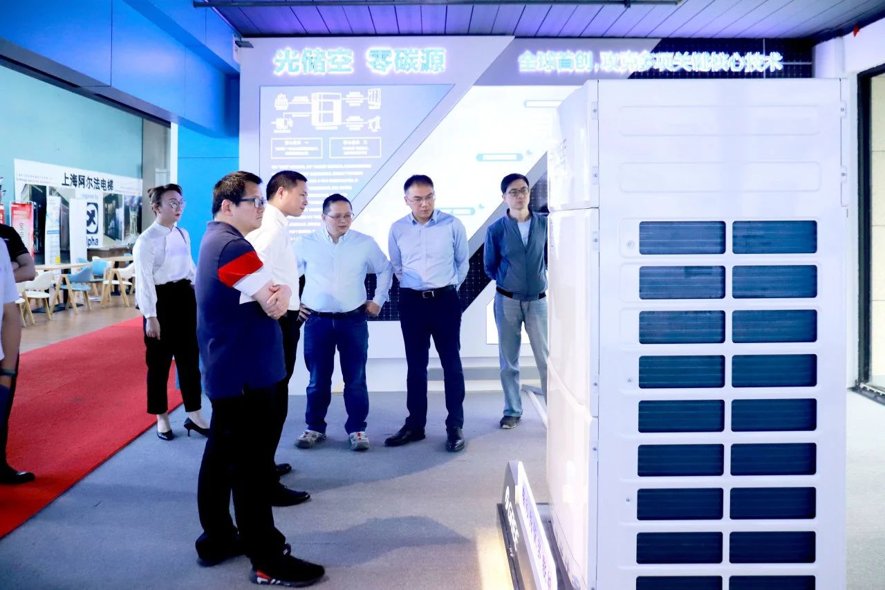 上?,F(xiàn)代建筑科技館領(lǐng)導(dǎo)一行在格力領(lǐng)導(dǎo)們的陪同下現(xiàn)場參觀了上海格力商用光伏新能源展廳,在上海格力商用部朱雄楓先生的講解下,詳細了解了格力光伏新能源技術(shù)的應(yīng)用。