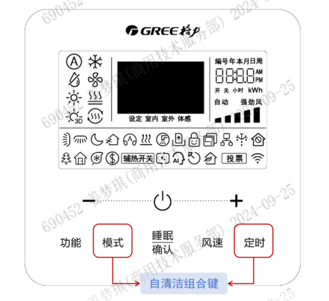 1.線控器cao作:空調(diào)開機(jī)或關(guān)機(jī)狀態(tài)下,同時按住遙控面板的“模式+定時”組合鍵約5秒鐘,即可開啟自清潔功能。若中途想退出該功能,按住“開關(guān)”鍵5秒鐘,或者重復(fù)按上述組合鍵cao作即可。