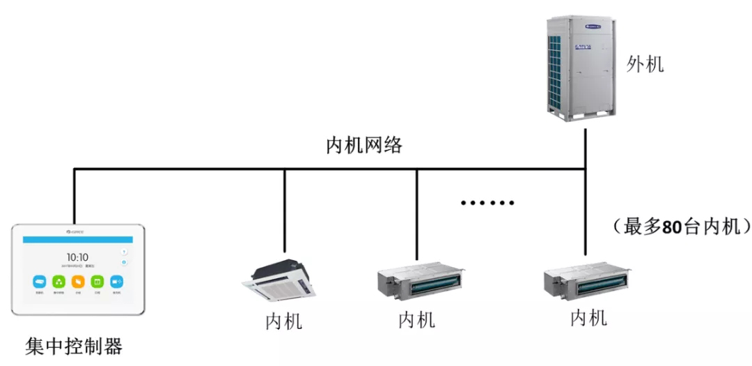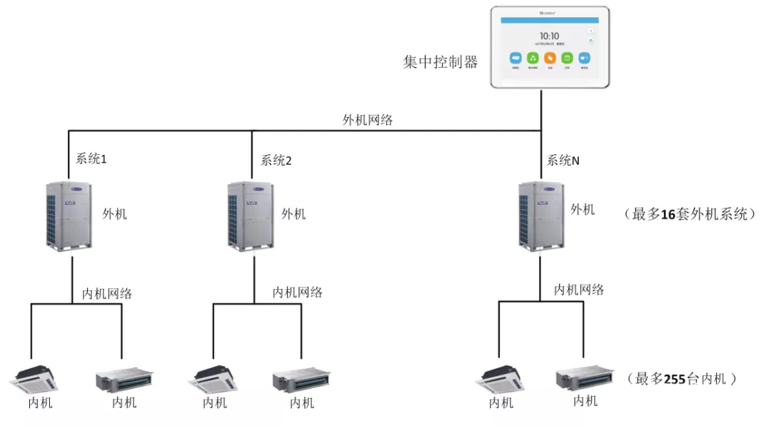 集中控制器可接入內(nèi)機、外機網(wǎng)絡(luò),當(dāng)接入外機網(wǎng)絡(luò)時,可以控制一個外機網(wǎng)絡(luò)下最多 16 套外機系統(tǒng) ( 一個外機網(wǎng)絡(luò)下,16 個內(nèi)機網(wǎng)絡(luò) ),最多控制 255 臺空調(diào)設(shè)備。當(dāng)接入內(nèi)機網(wǎng)絡(luò)時,最多控制一套外機系統(tǒng)下 80 臺空調(diào)設(shè)備。