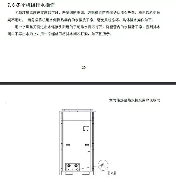例如:說明書請查看冬季機(jī)組排水操作內(nèi)容