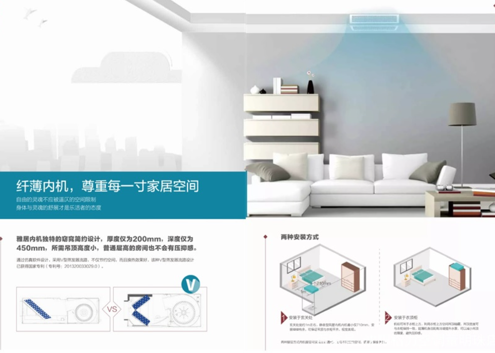 2.整體設(shè)計美觀(外機精巧,散熱更好,保證機組穩(wěn)定運行;內(nèi)機更薄,不占生活空間)