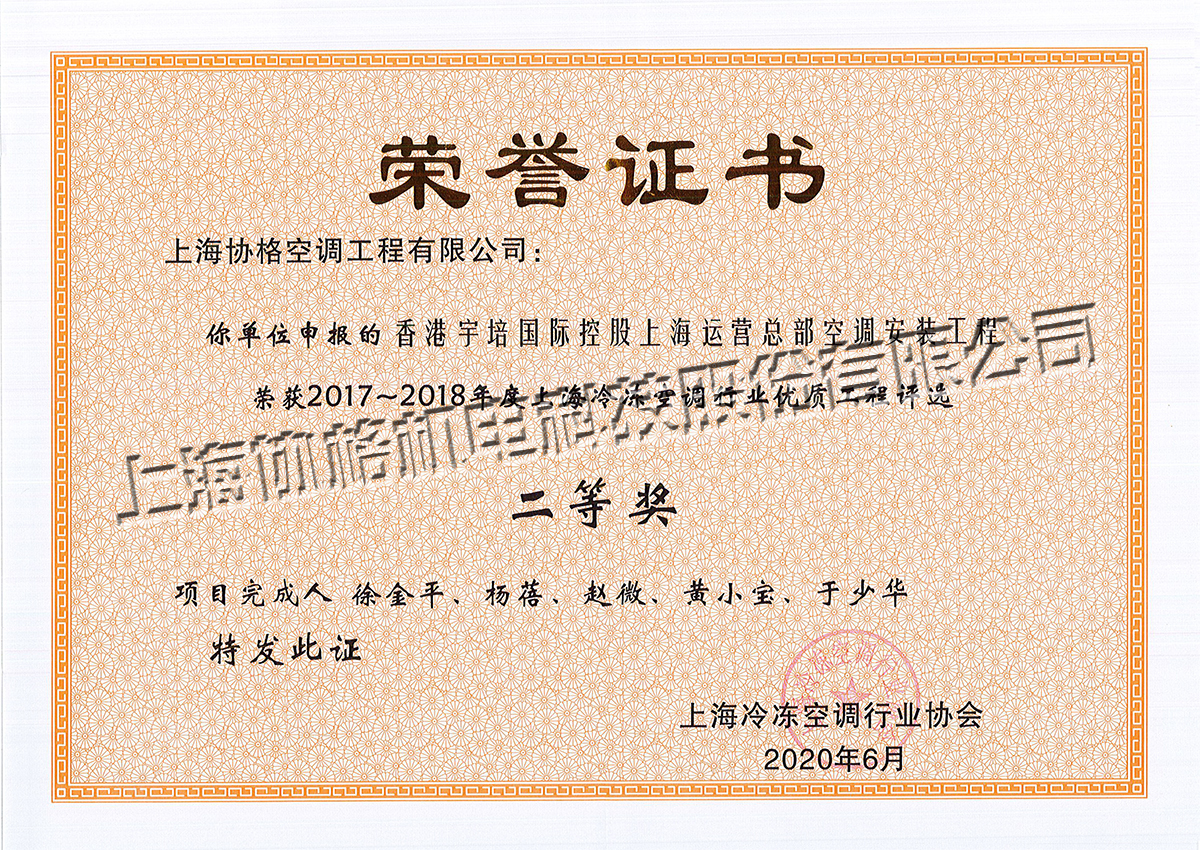 香港宇培國際控股上海運(yùn)營總部空調(diào)安裝工程二等獎(jiǎng)