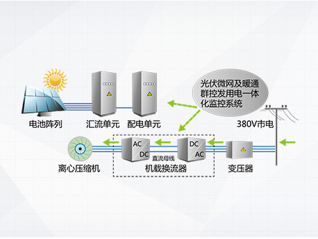 光伏發(fā)電系統(tǒng)不發(fā)電,主機(jī)向電網(wǎng)取電運(yùn)行,機(jī)組相當(dāng)于常規(guī)變頻離心機(jī)。