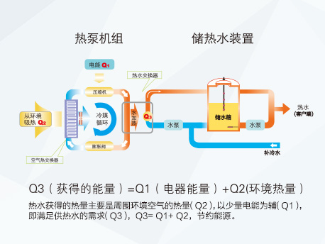 商用空氣能熱水器依據“逆卡諾”原理工作,以制冷劑為載體,將室外環(huán)境空氣的熱量,源源不斷的輸送到水側換熱器,再將熱量傳遞到水中,供給用戶以滿足生活熱水的需求。
