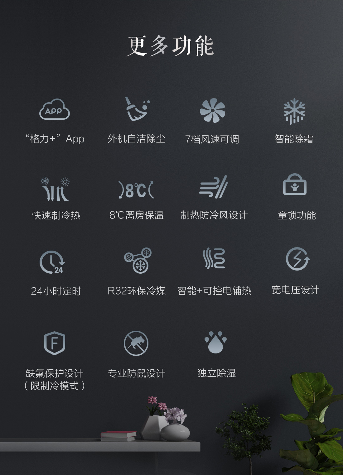 主要特點(diǎn):分布式送風(fēng) 冷等離子殺菌 第二代格力冷酷外機(jī) 格力+APP