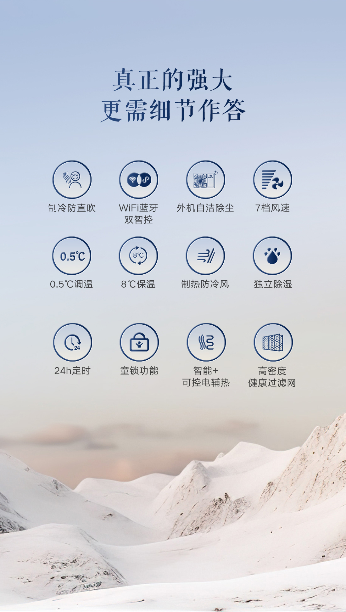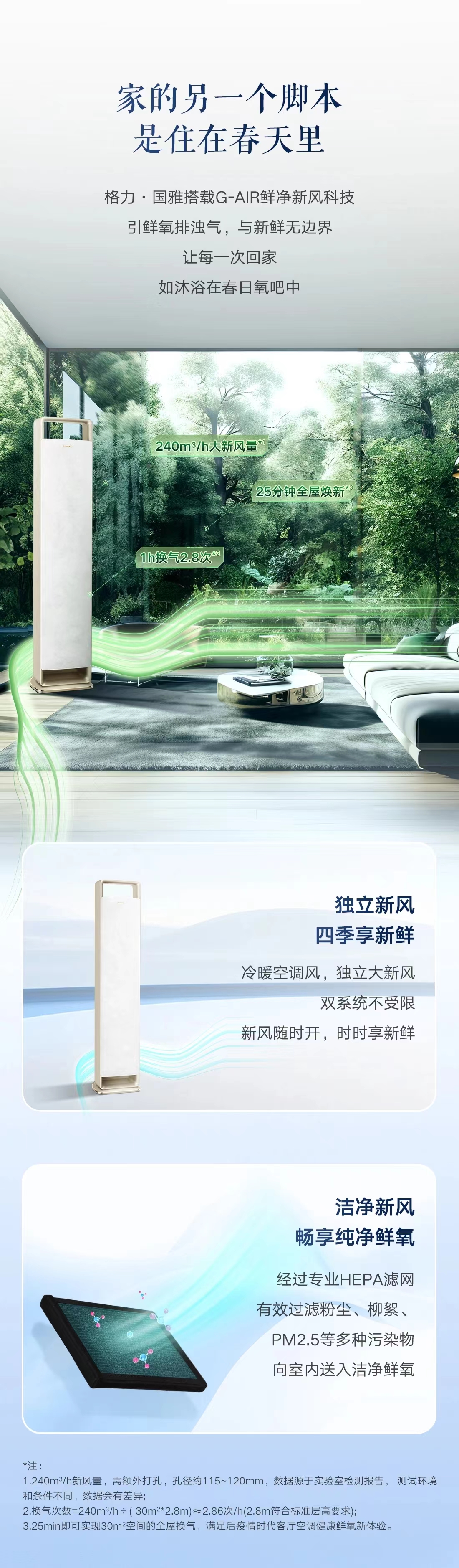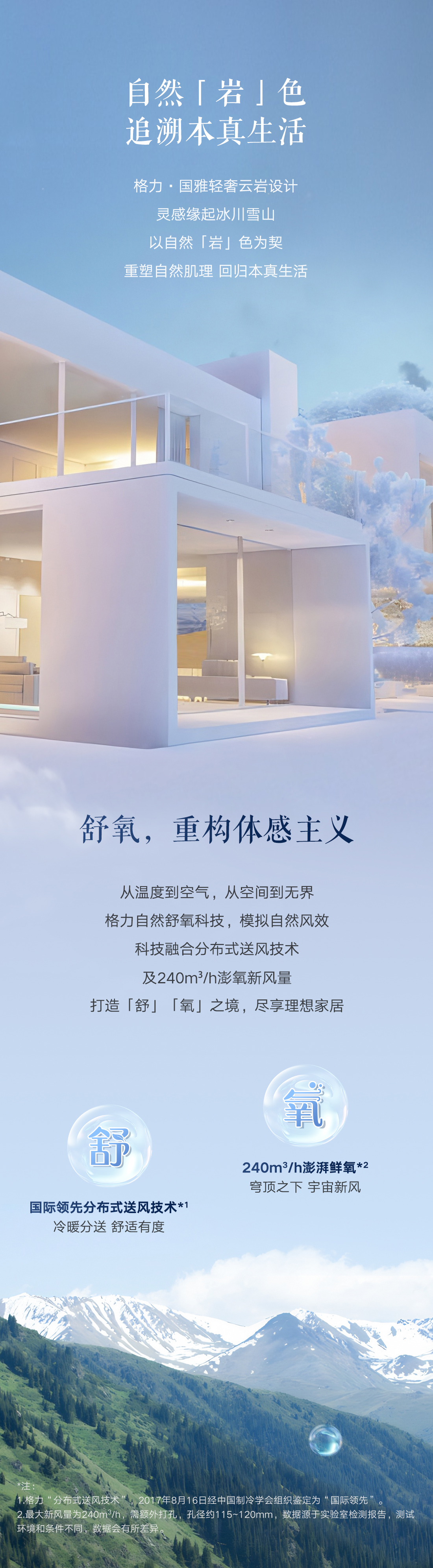 搭載格力舒氧科技,模擬自然風(fēng)效,科技融合分布式送風(fēng)技術(shù)及240m3/h澎氧新風(fēng)量,打造舒氧之境,重構(gòu)體感主義。