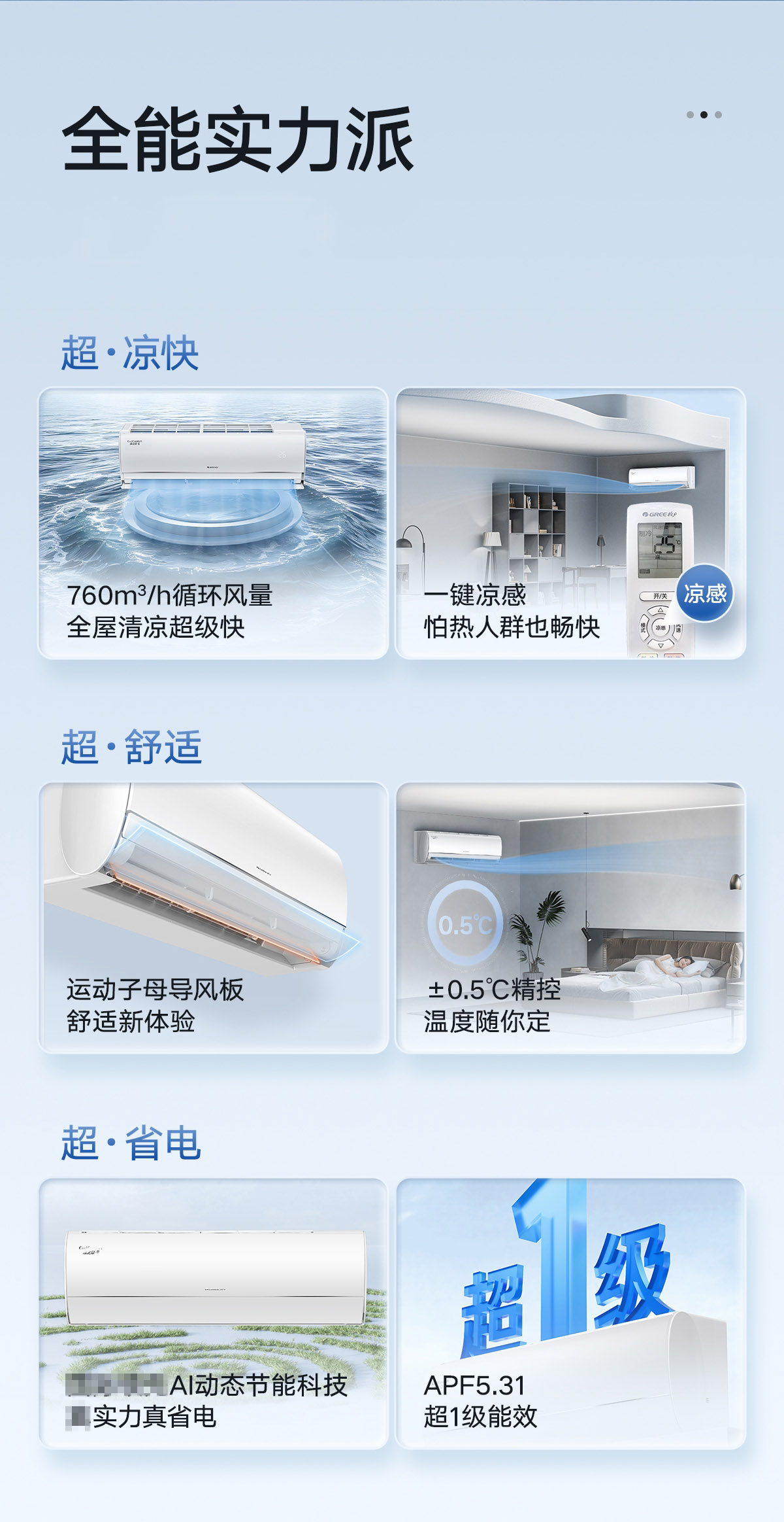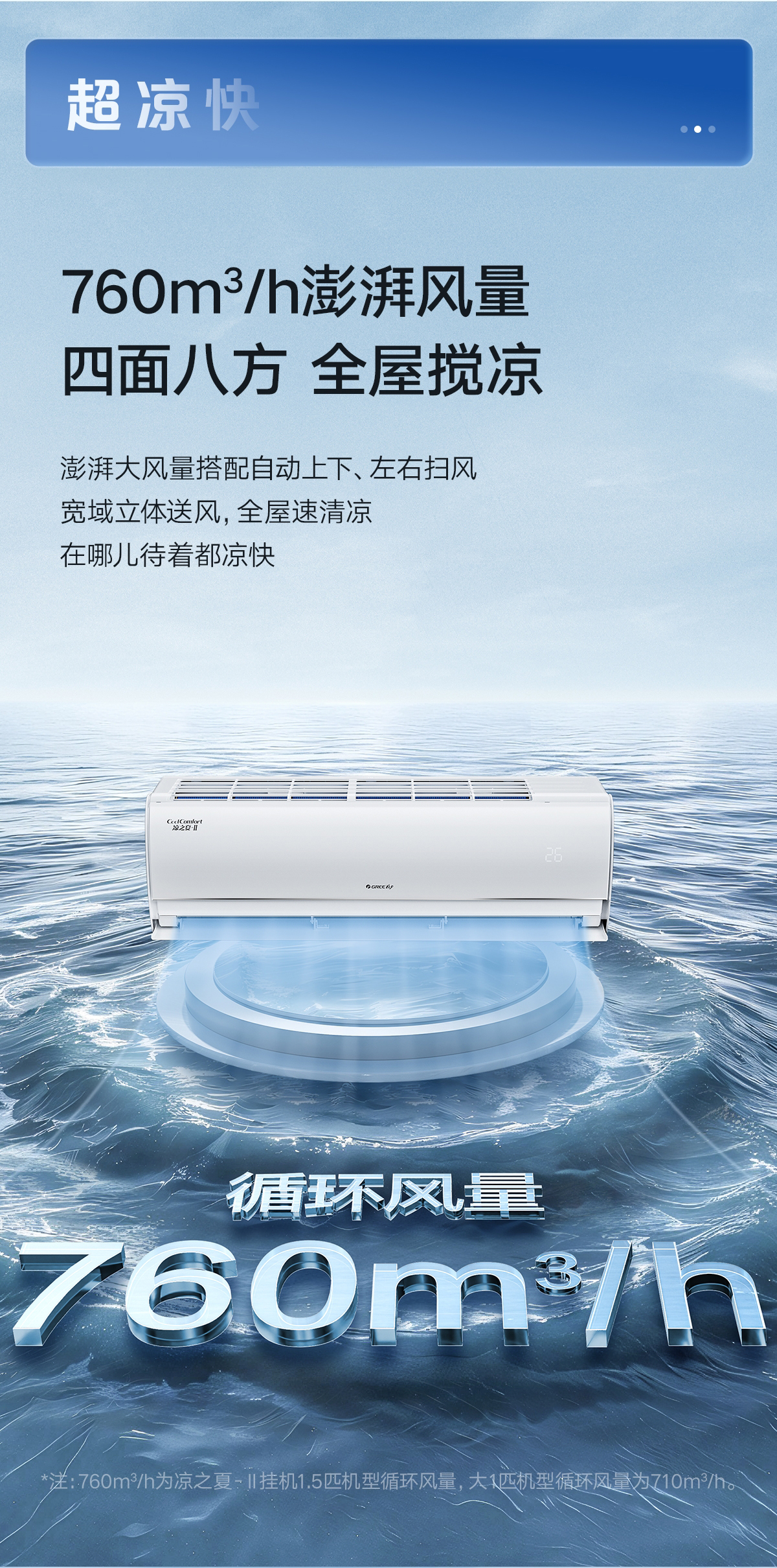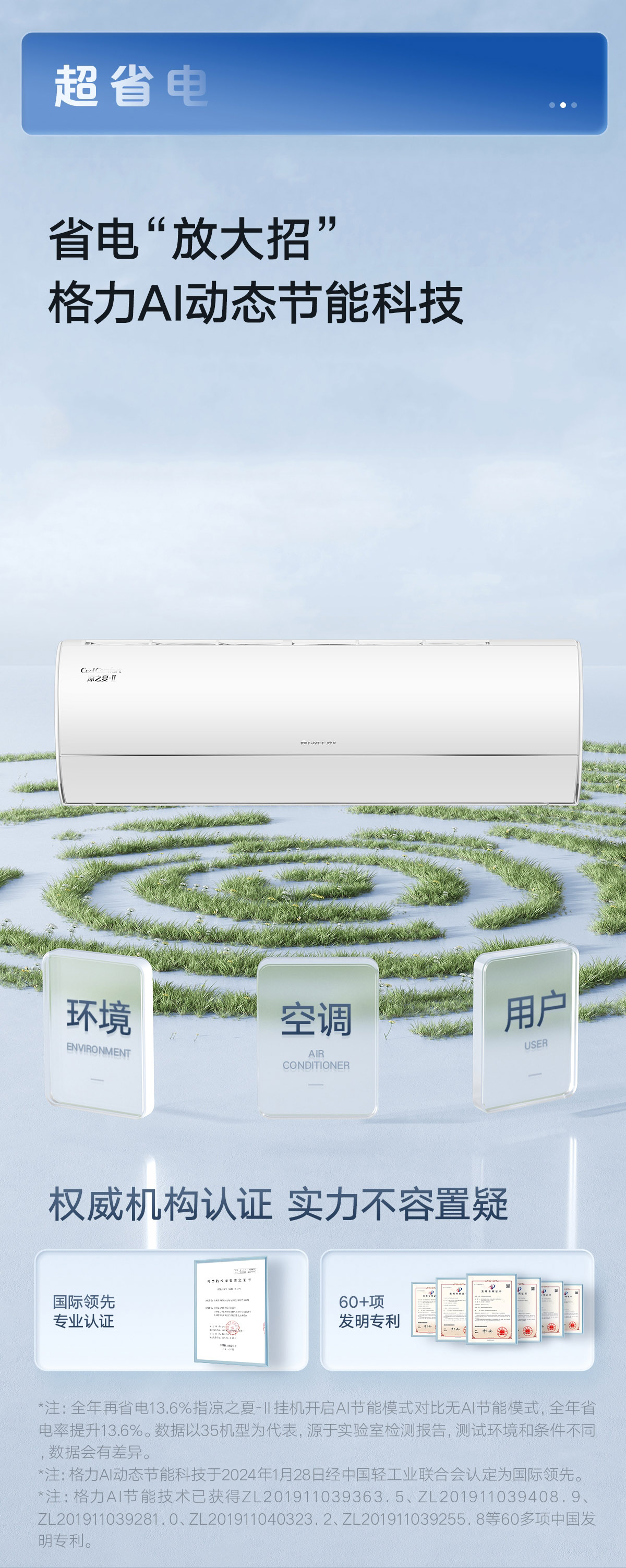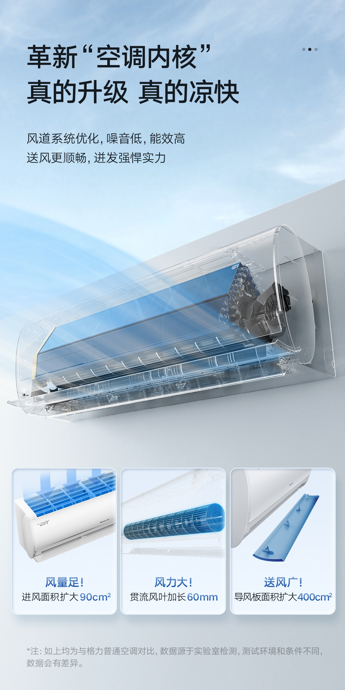 格力涼之夏-Ⅱ掛機(jī),全新升級(jí),新一代。澎湃風(fēng)量,清涼不等待。搭載運(yùn)動(dòng)子母導(dǎo)風(fēng)板,冷風(fēng)不吹人,全域有涼感。更有AI動(dòng)態(tài)節(jié)能科技。